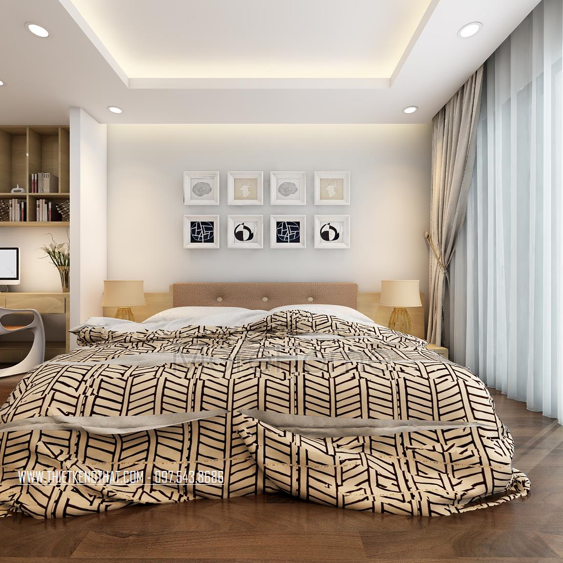 Tiếp theo là thiết kế nội thất phòng ngủ hiện đại, tone màu mà kiến trúc sư sử dụng vẫn là tone màu be sáng pha chút nâu nhẹ nhàng. Với việc lựa chọn màu sắc như vậy, kiến trúc sư mang đến cho không gian sống một sự tinh tế và sáng trọng khó cưỡng. Bên cạnh đó, việc sử dụng tone màu sáng cũng góp phần tạo cảm giác cơi nới cho không gian hẹp. Thiết kế kệ tủ đơn giản, kết hợp đa năng tạo một khung đứng vững chãi, đảm bảo tính công năng lại không làm ảnh hưởng nhiều đến diện tích sử dụng.