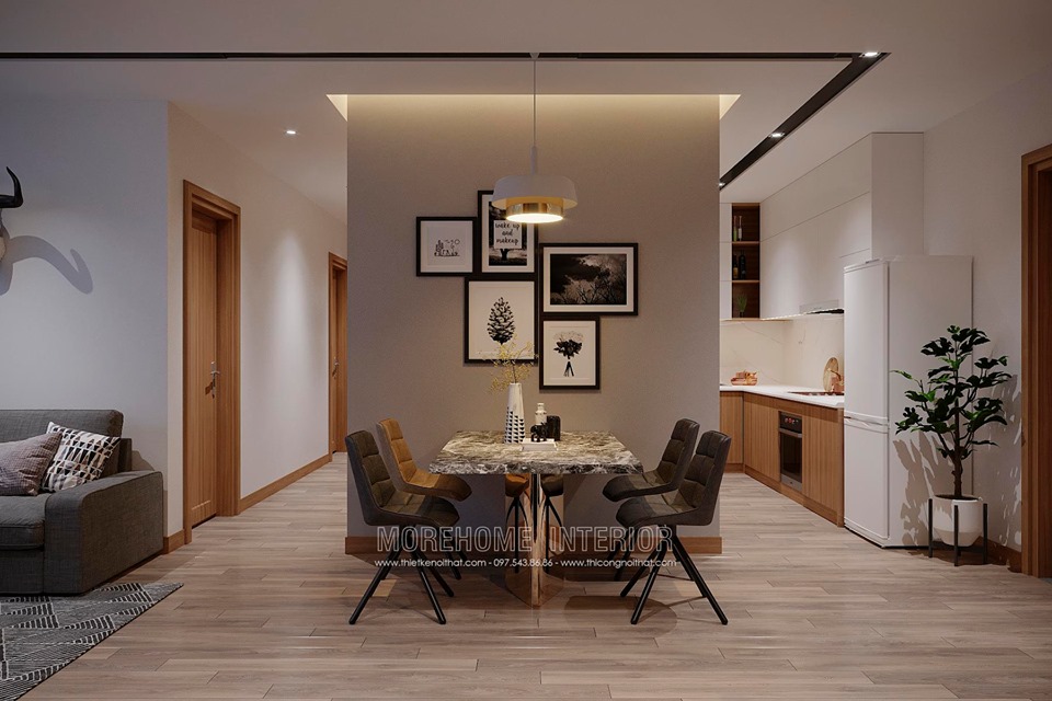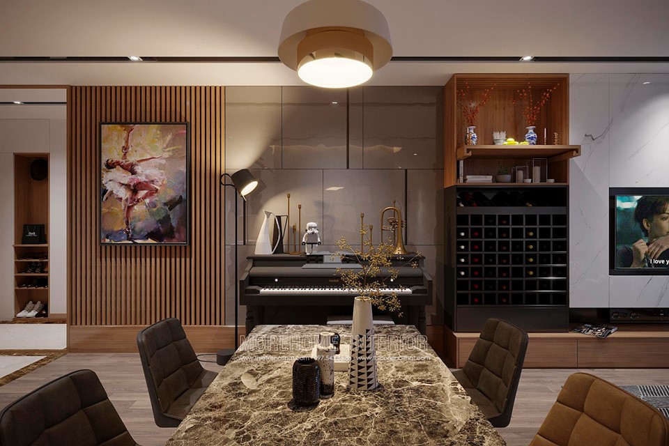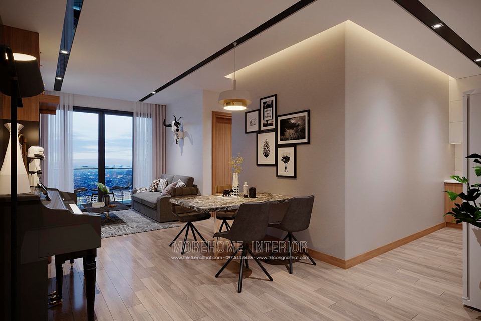 Liền kề với không gian phòng khách là không gian ăn uống. Không gian đoàn tụ của gia đình sau một ngày làm việc mệt mỏi được KTS Morehome bố trí với bộ bàn ăn dành cho 4 người mềm mại, tinh tế được đặt ngay mảng tường ngăn phòng diện tích phù hợp. Mảng tường được trang trí tranh décor nghệ thuật. Không gian ăn uống lãng mạn hơn với chiếc đàn piano màu đen được đặt đối diện bộ bàn ăn, bên cạnh đó còn được trang trí đèn cây hiện đại tạo thêm vẻ ấm cúng cho không gian.