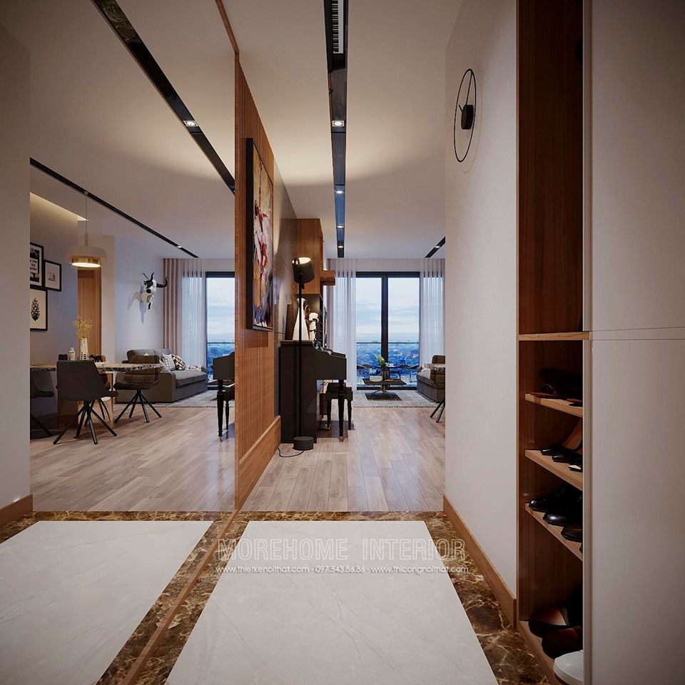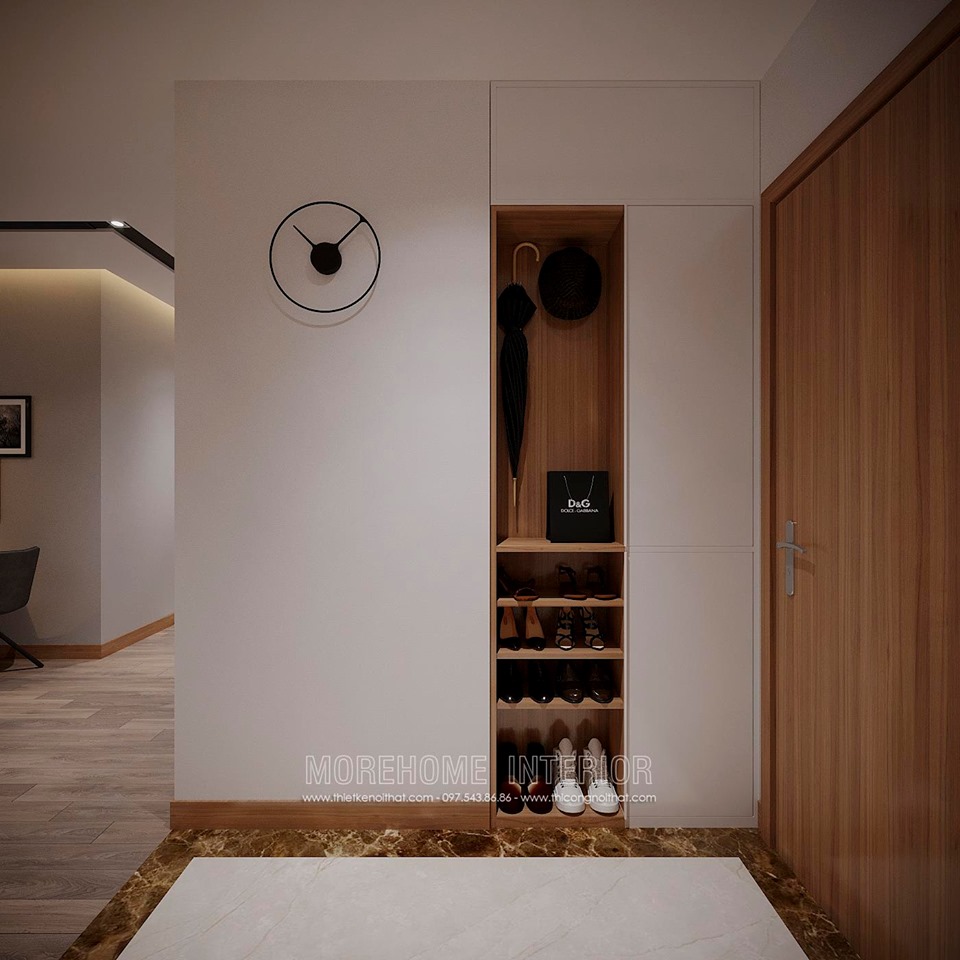 Bước chân vào căn hộ bạn sẽ bắt đầu bị cuốn hút bởi không gian để giày dép, túi xách ngay cửa ra vào. Tủ gaify dép túi xách được thiết kế đơn giản nhưng đầy tiện nghi. Một tấm gương lớn được đặt ở không gian này giúp cho việc trau chuốt bản thân và giúp cho không gian căn hộ thêm rộng rãi.
