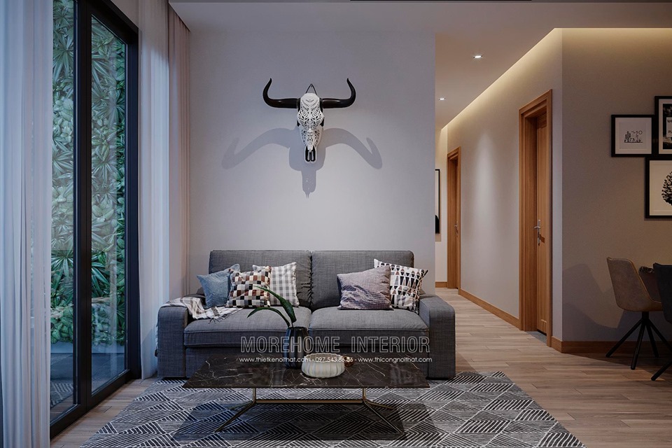 Thiết kế nội thất phòng khách chung cư hiện đại luôn được bố trí đơn giản về màu sắc và đồ nội thất. Nội thất phòng khách chung cư này được bài trí với các mẫu đồ nội thất sau: