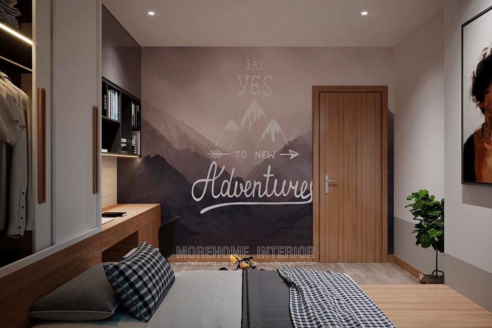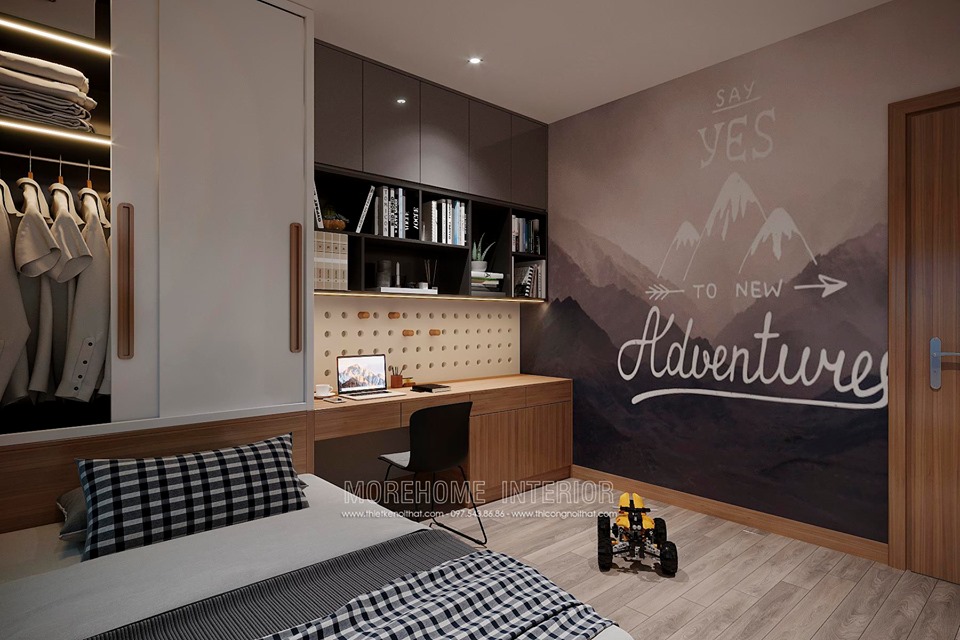 Phòng ngủ con trai lớn sinh động hơn với màu sắc sáng và họa tiết lá cây của giấy dán tường. Phòng ngủ này được bố trí kệ tủ thông minh, hệ thống kệ tủ thiết kế mở và cửa trượt giúp tiết kiệm diện tích cho căn phòng. Bộ chăn ga trải giường đơn giản nhưng bắt mắt dễ dàng tìm kiếm trên thị trường. Thảm trải sàn cũng có gam màu xanh mang mang đến sức sống mãnh liệt. Các mẫu đồ nội thất khác như tab cửa sổ, bàn học, kệ sách mang đến sự hoàn hảo cho không gian phong ngủ bé trai.