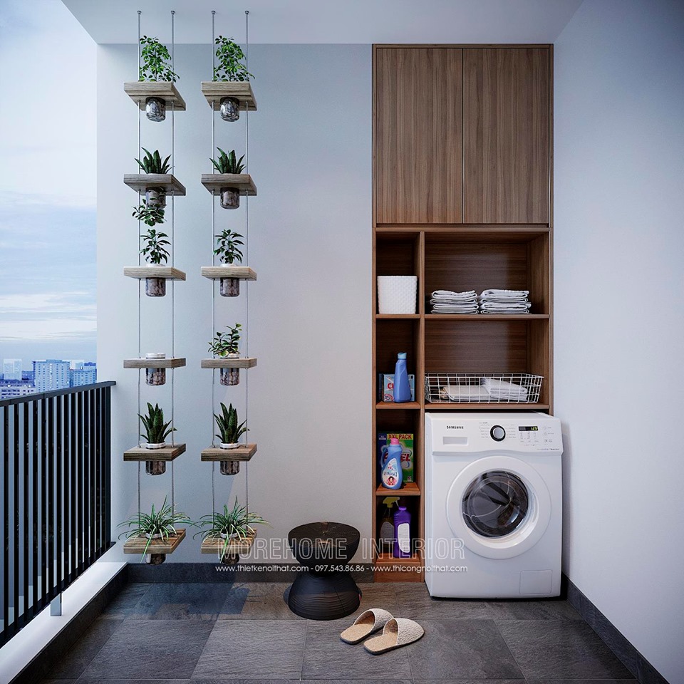 Logia căn hộ này được tận dụng tối đa. Không gian này được thiết kế làm khu vực giặt đồ, lưu trữ đồ, bên cạnh đó một giàn cây xanh thông minh cũng làm cho không gian không bị thô, cộc cằn. Khu vực logia này cũng xuất hiện chất liệu gỗ công nghiệp mang lại sự thân thiện.