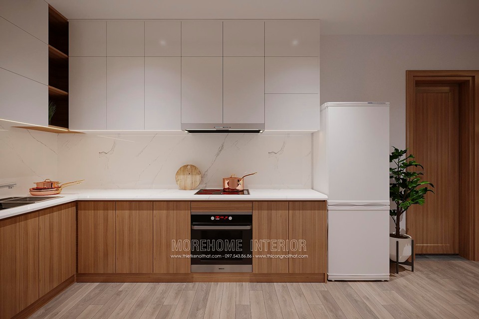 Không gian phòng bếp hiện đại, đơn giản với chất liệu gỗ công nghiệp cao cấp. phòng bếp căn hộ được thiết kế với gam màu chủ đạo là gam màu trắng và vàng tươi mới của gỗ công nghiệp. Hệ thống tủ bếp với 2 gam màu chính là màu trắng cho hệ tủ trên và màu vàng cho hệ tủ dưới. Tường bếp và bàn bếp được ốp đá hoa cương nhân tạo màu trắng mang đến sự tinh tế, sang chảnh. Tủ bếp được thiết kế đa năng với hệ thống thiết bị bếp thông minh.