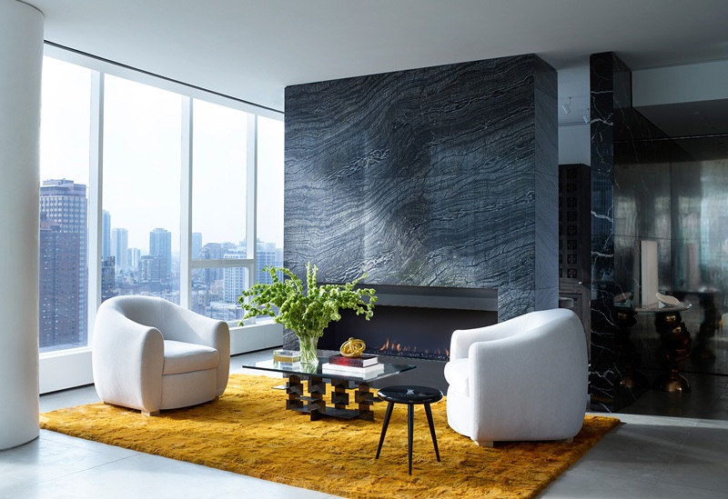 Giữa một căn phòng toàn tone màu trung tính mang cảm giác lạnh lẽo, điểm tô vào đó là một tấm thảm lông màu vàng ấm áp. Xung quanh là chiếc ghế êm ái màu trắng. Bạn sẽ thấy cả căn phòng như bừng sáng và nổi bật hơn rất nhiều nhờ chi tiết tấm thảm này. Nó sẽ giúp bạn cảm thấy thật êm ái khi đặt chân lên, cùng thư giãn nhâm nhi những tách trà, café và trò chuyện với người thân và bạn bè một cách thoải mái.