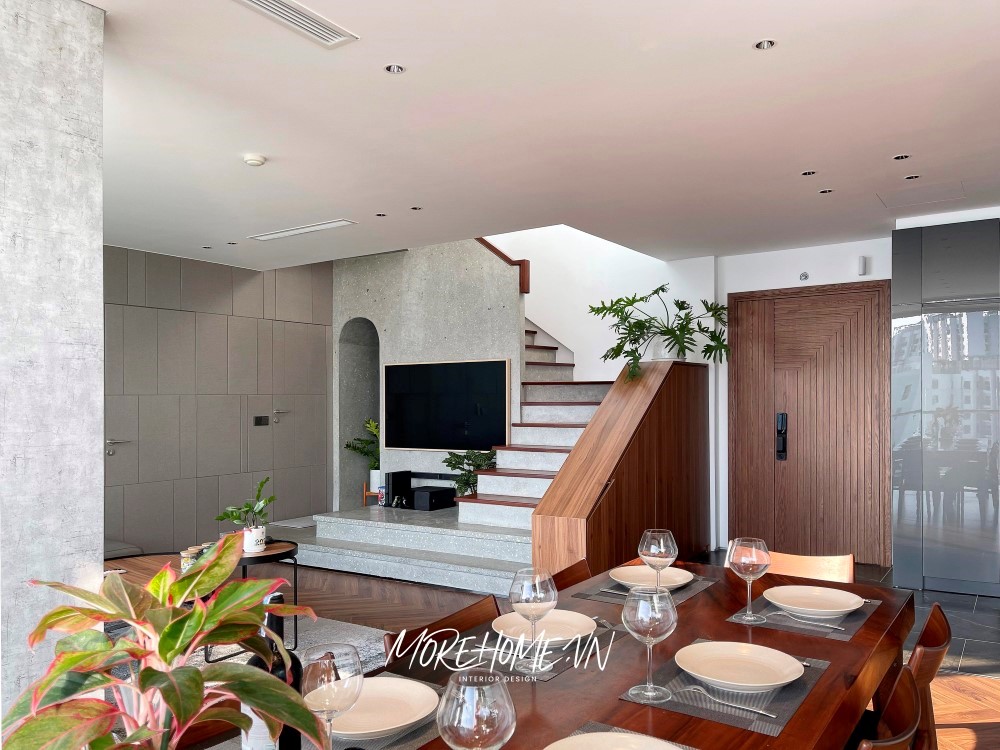 Thiết kế nội thất nhà phố Hà Nội sử dụng gỗ óc chó tạo điểm nhấn chủ đạo - Nội thất Morehome