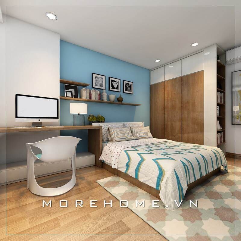 Mẫu thiết kế nội thất phòng ngủ chung cư đơn giản nhưng hiện đại, bàn làm việc được kết hợp với giường ngủ sẽ giúp cho gia chủ cảm nhận được sự thoải mái và tiện dụng hơn.
